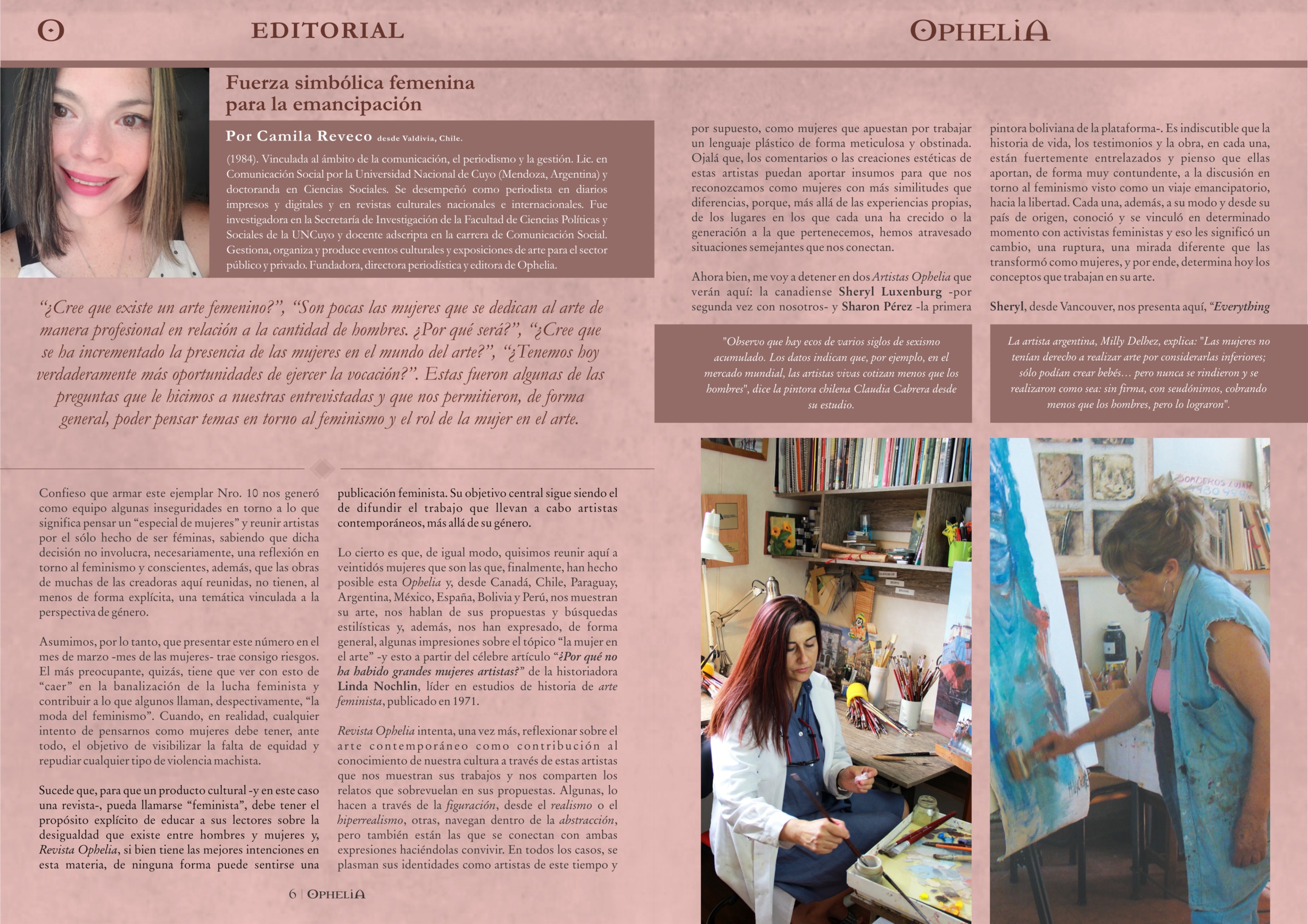 ↪️CURIOSIDADES: Revista Ophelia Nro. 10 -publicado en marzo de 2021 desde Valdivia, Chile- es el primer número dedicado exclusivamente a la obra de mujeres. Por otra parte, cada entrevista se publicó en inglés y en español, dando como resultado el ejemplar más extenso de nuestra plataforma, tanto en número de páginas (174) como de artistas (21) y poetas convocadas para el dossier «El jardín de Ophelia» (10).