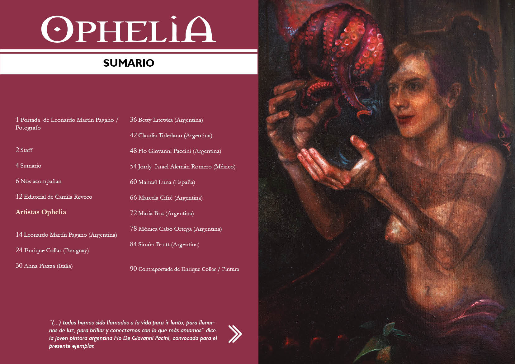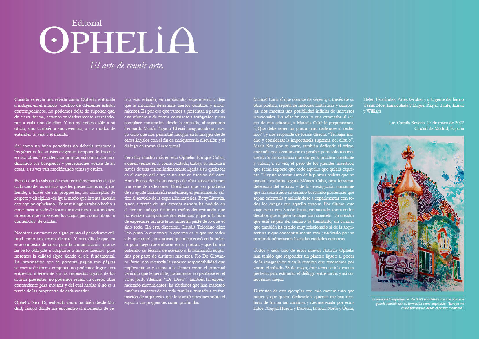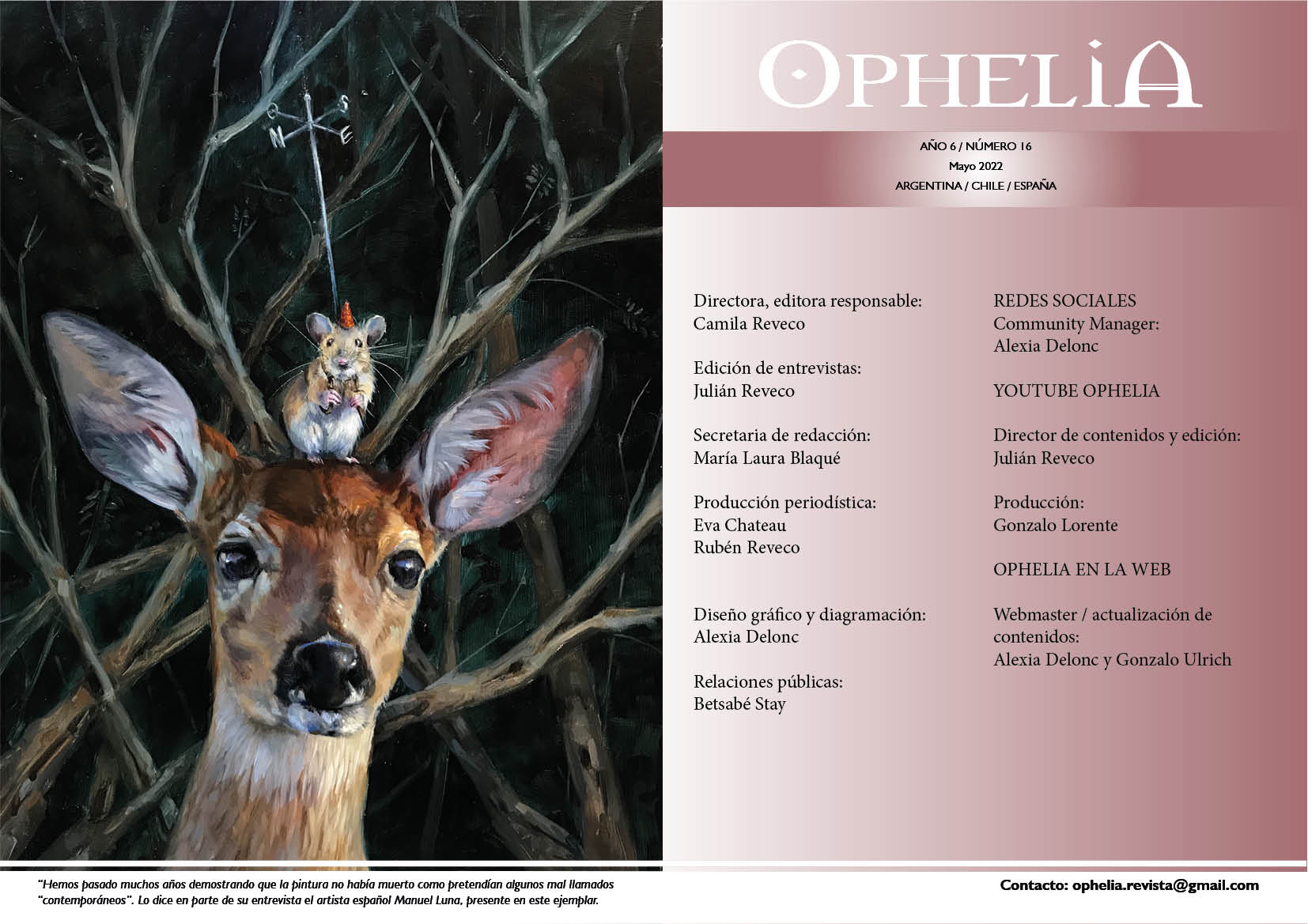 ↪️CURIOSIDADES: Revista Ophelia Nro. 16 es el primer ejemplar que exhibe obra fotográfica en su portada, en este caso del artista Leonardo Martín Pagano. Por otro lado, este ejemplar se publicó en mayo de 2022 desde Madrid, España, siendo la primera Ophelia que nuestra directora, Camila Reveco, edita desde el Viejo Continente.