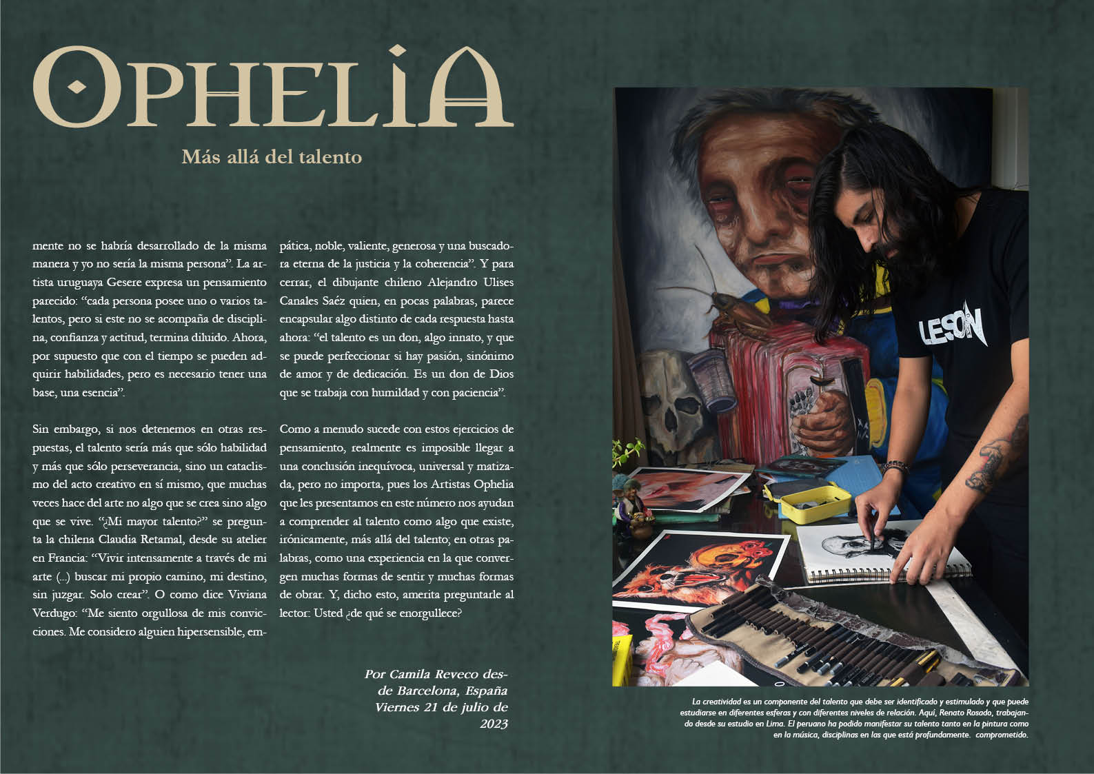 OPHELIA es una plataforma que difunde la obra de artistas visuales de distintos países. Además de nuestro emprendimiento editorial, también realizamos los «Encuentros Ophelia» en nuestro canal de YouTube: charlas en vivo con los artistas de nuestra comunidad para conocer más de sus mundos creativos; y los «Conversatorios Ophelia»: instancias de discusión entre artistas de nuestra comunidad para debatir distintas temáticas en relación al oficio, porque en Ophelia no solo buscamos crear espacios de divulgación, sino también de reflexión en torno al arte y la cultura ❤️