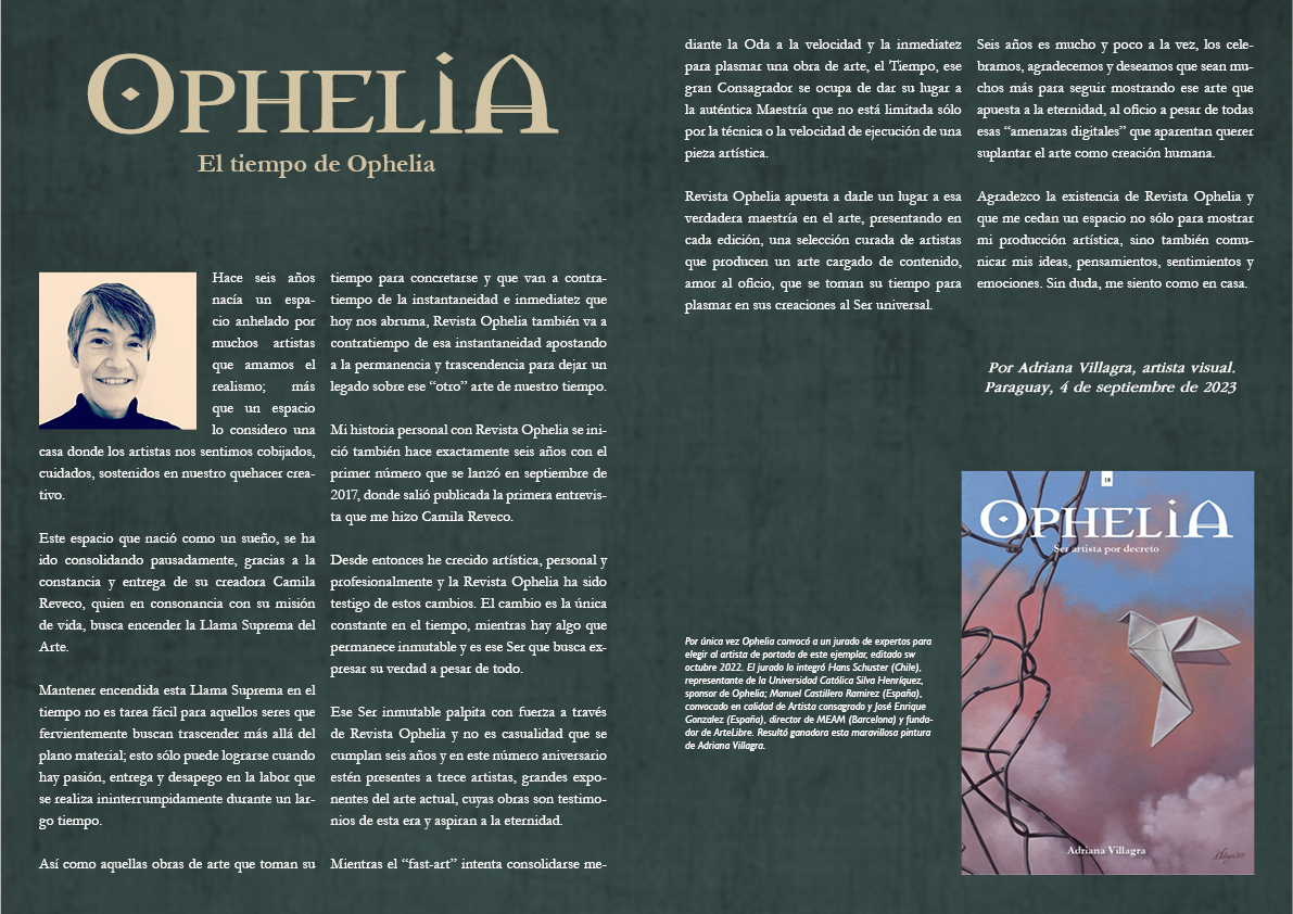 ↪️ Este ejemplar presenta un artículo de la artista paraguaya Adriana Villagra quien ha sido testigo de nuestro recorrido desde Revista Ophelia Nro. 01.