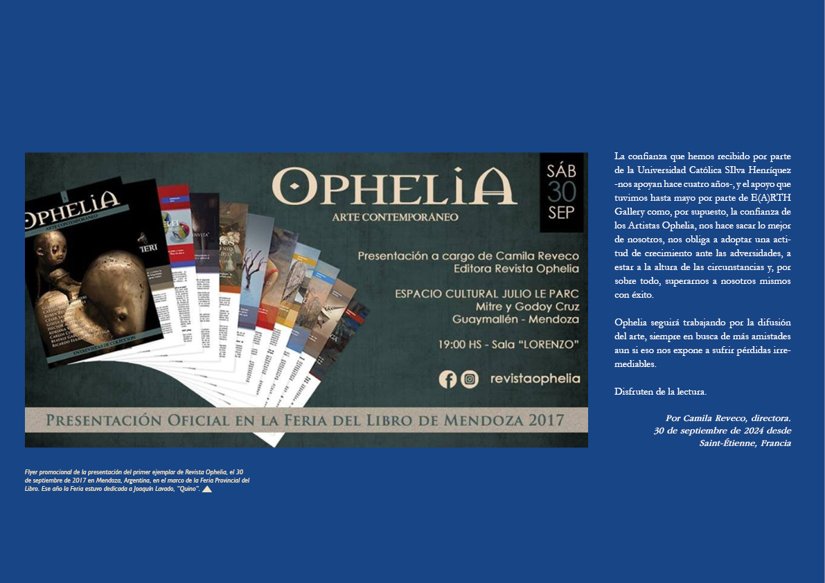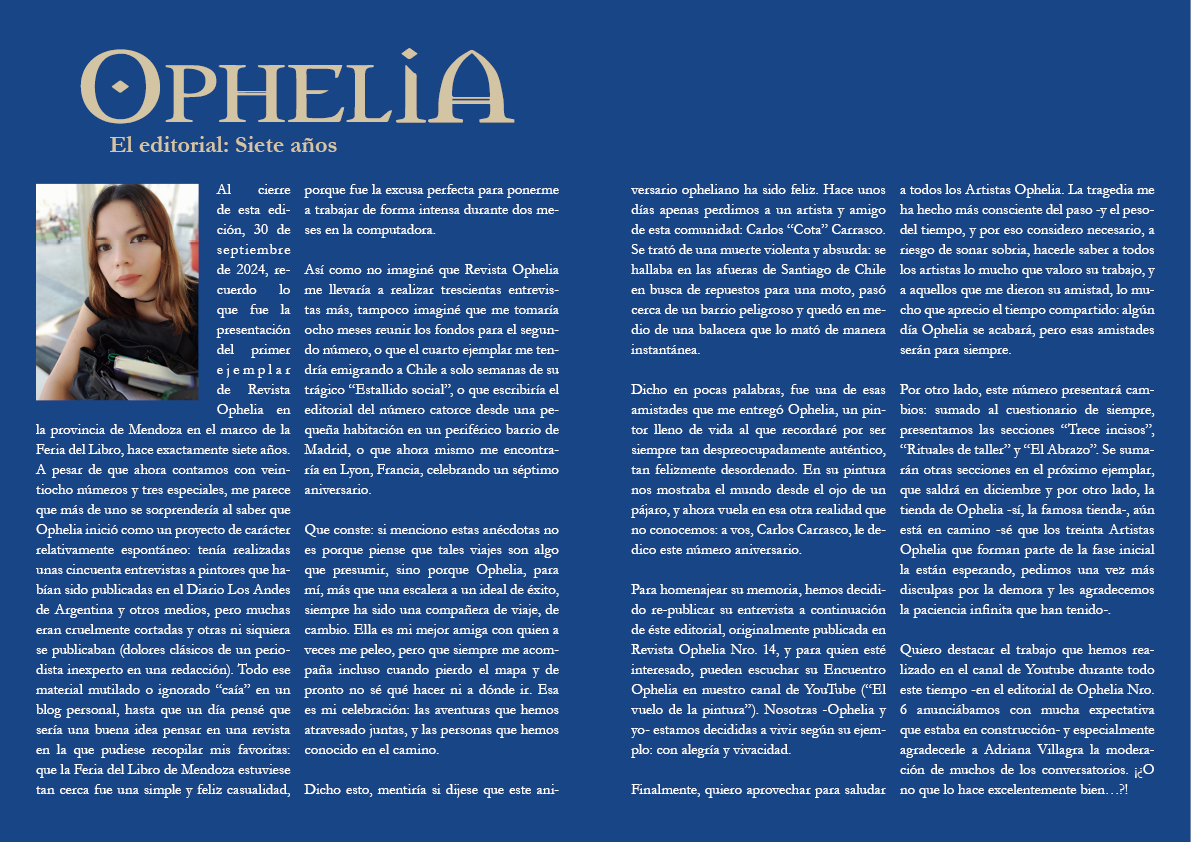❤️ ¡Descarga Revista Ophelia Nro. 28: ¡Especial Aniversario! En esta edición, editada desde Francia, celebramos siete años de arduo trabajo en el ámbito cultural, y lo hacemos a lo grande: 72 páginas repletas de arte, además de nuevos formatos de conversación con los artistas, sumados al clásico cuestionario opheliano. ¡No te lo pierdas!