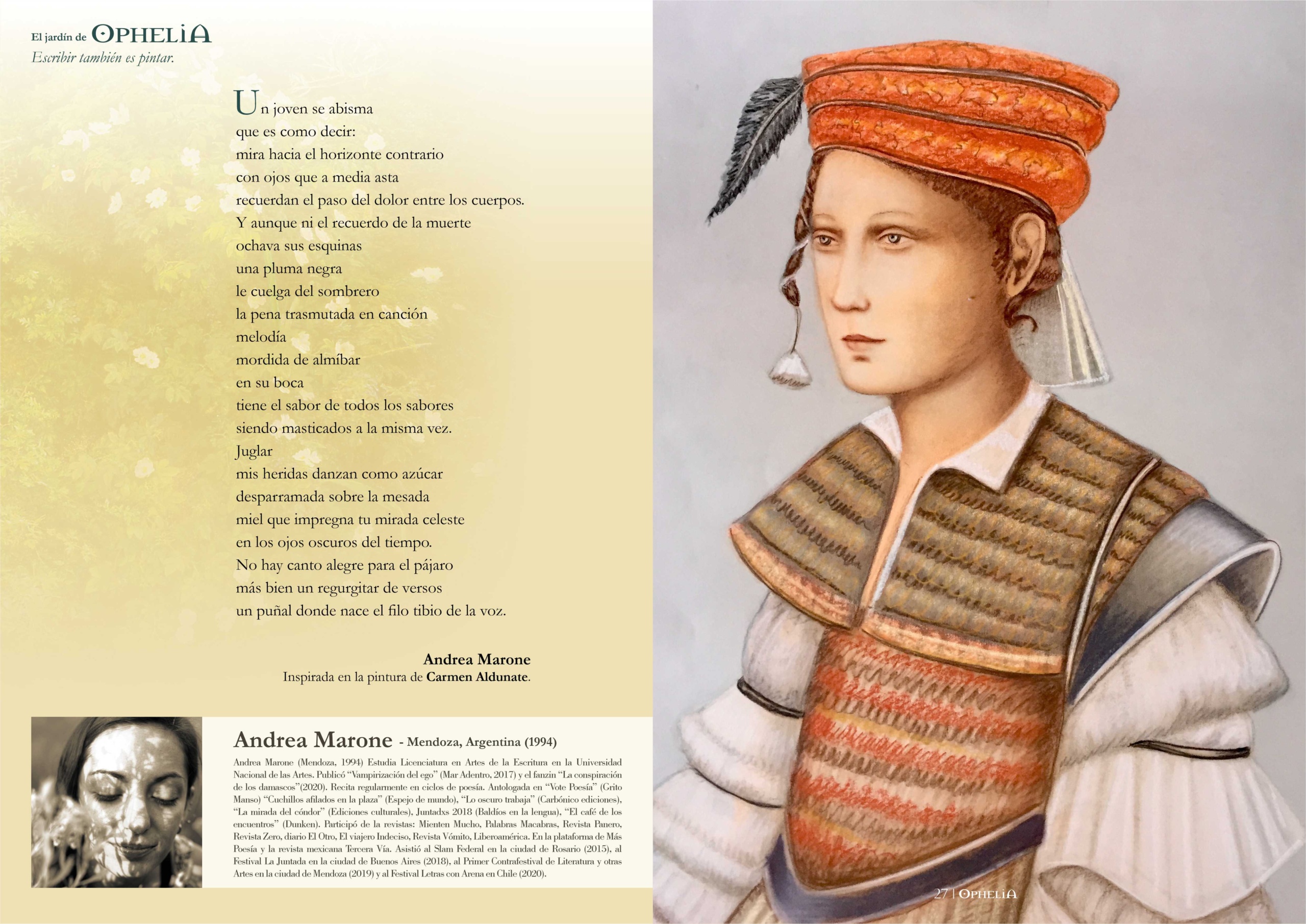 ↪️CURIOSIDADES: Revista Ophelia Nro. 05 se publicó en abril de 2020 en Santiago de Chile, y este número presenta por primera vez a «El Jardín de Ophelia», un dossier de literatura coordinado desde Argentina por Andrea Marone. En «El Jardín» se convocaron a distintos poetas para que escriban una pieza original inspirada en la obra de un Artista Ophelia a elección, creando un diálogo entre las artes escritas y las artes visuales